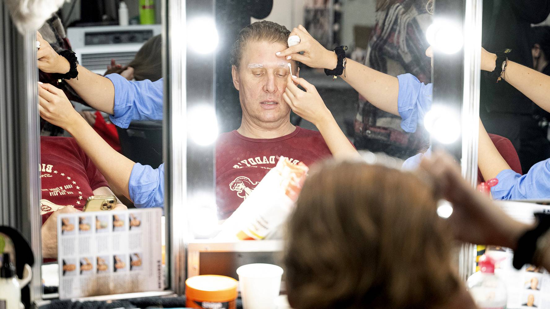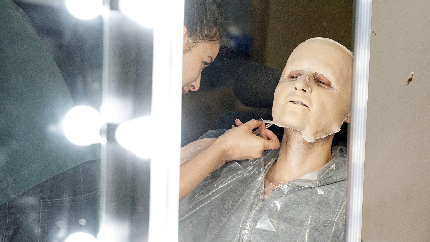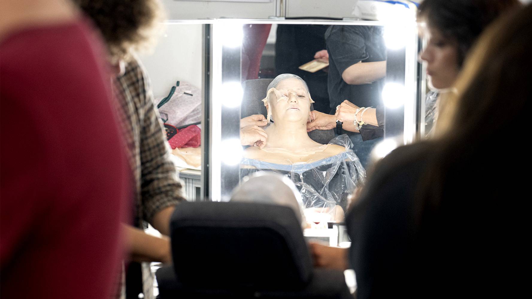W lustrze nie widać już twarzy uczestnika - tylko bohatera, w którego za chwilę wcieli się gwiazda. To rezultat długich godzin pracy przy klejeniu masek, dopasowywaniu makijażu czy peruk, a także nanoszeniu detali. Na zdjęciu Natalia Muianga przygotowująca się do swojej roli.
