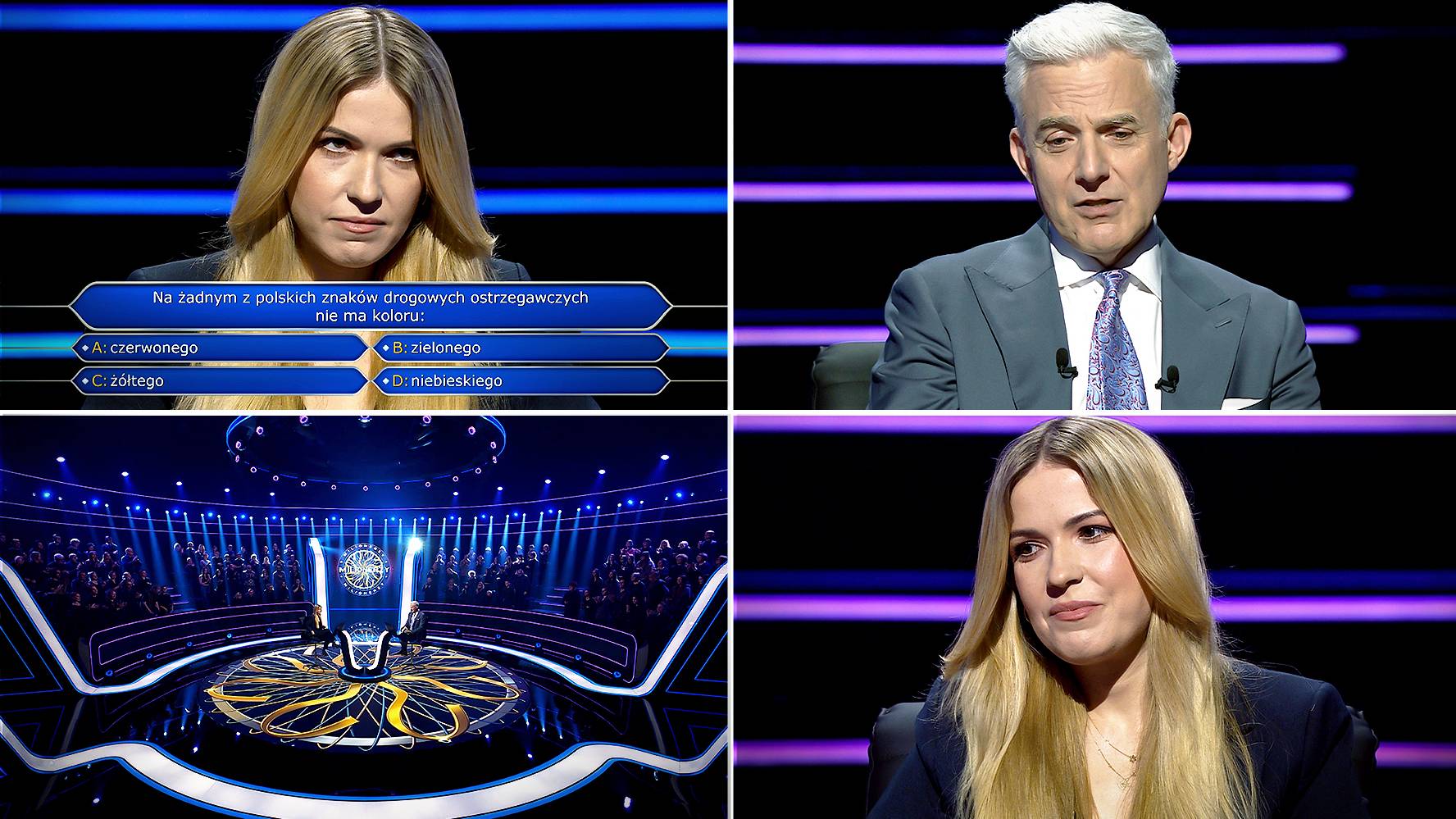 Przejście przez pytanie gwarantowało 10 tysięcy złotych i spokój na dalszy etap gry. Marta Krzeszkiewicz poprosiła więc o pomoc Huberta Urbańskiego. On, w zgodzie z zasadami koła ratunkowego, zasugerował uczestniczce odpowiedź B. Lektorka języków obcych, nieco wbrew własnej intuicji, postawiła na kolor zielony. Ale to błąd, bo prawidłowa opcja to D. Na znakach ostrzegawczych nie ma koloru niebieskiego.