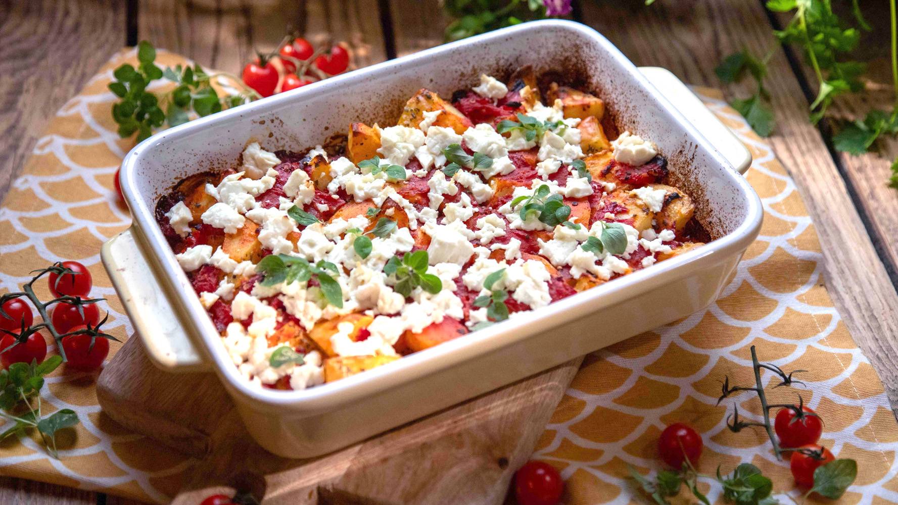 Już w zupie znajduje się solidna porcja wołowiny, więc na drugie coś bezmięsnego - ziemniaki zapiekane z pomidorami i greckim serem feta.