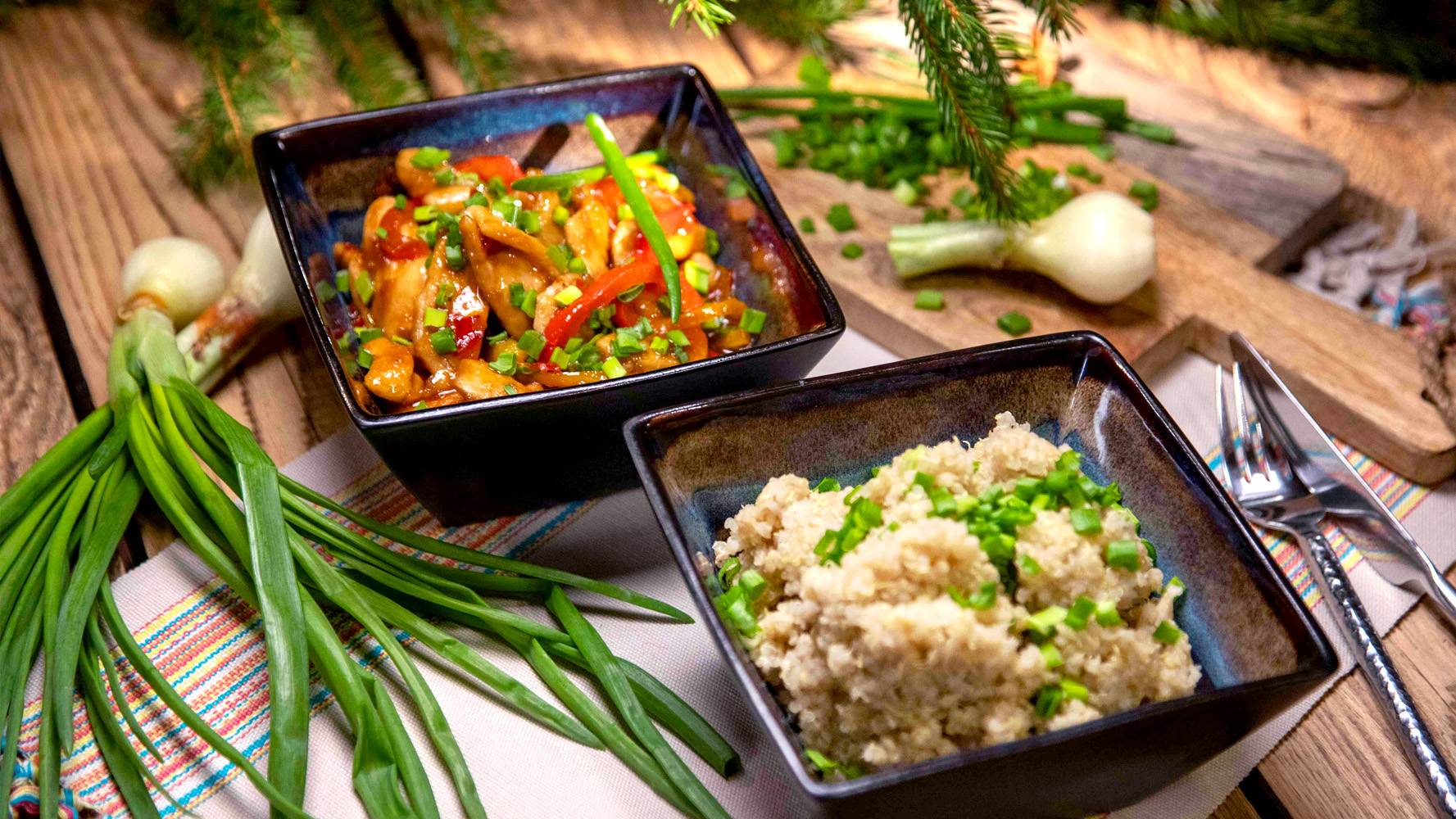 Danie główne jest azjatyckie w charakterze. To kurczak w słodko-kwaśnym sosie imbirowym, podany z bardzo zdrową, choć wciąż niedocenianą, komosą ryżową.