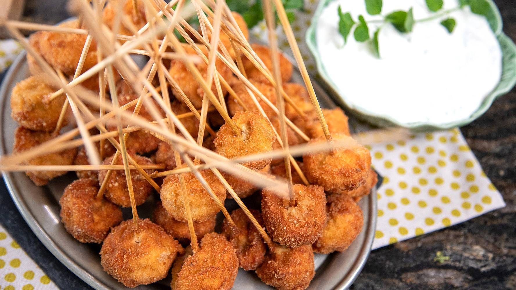 Kiedy pieczarki są gotowe, odsącz je na ręcznikach papierowych. Podawaj z sosem czosnkowym.