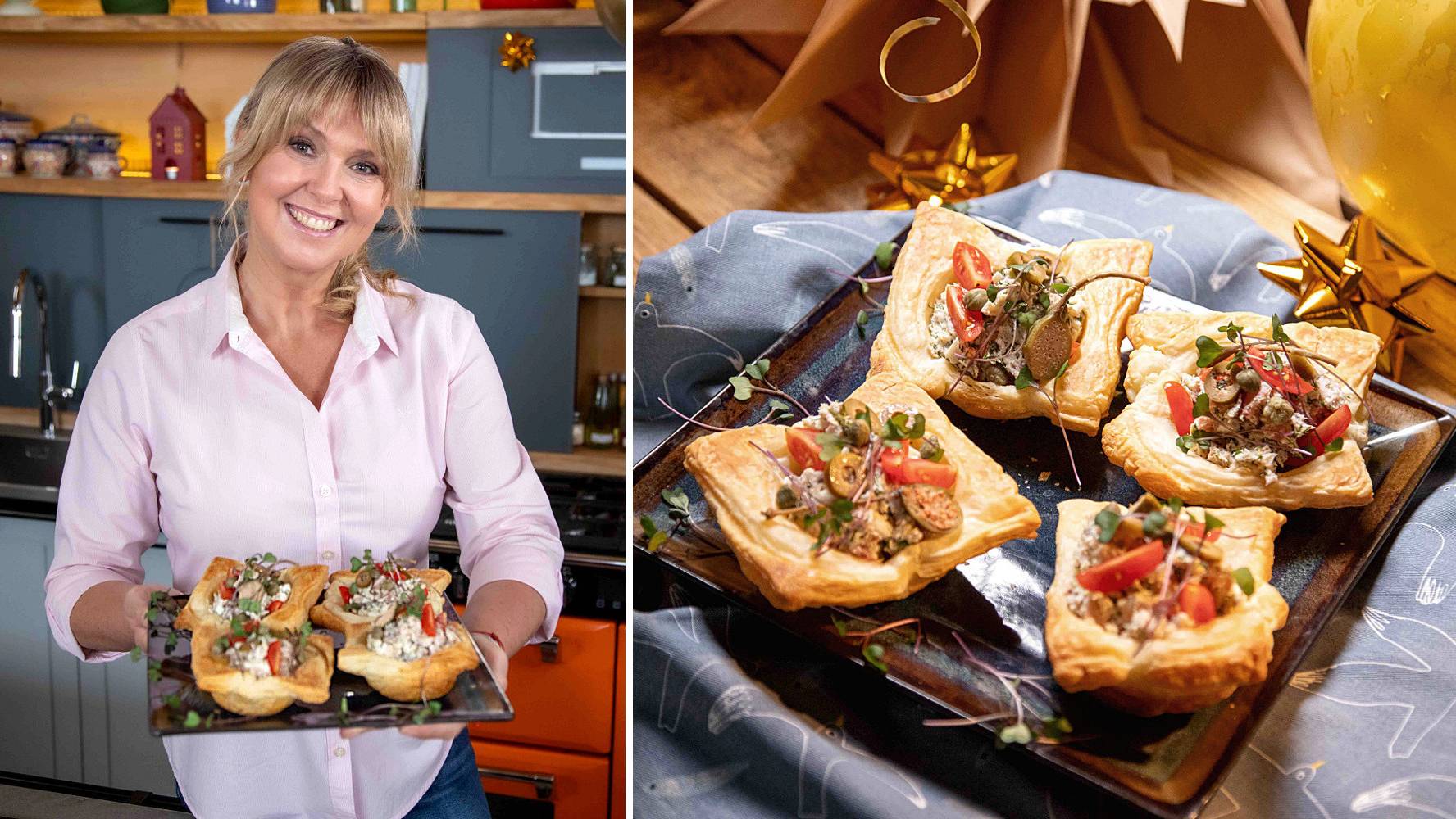 Farsz włóż do koszyczków z ciasta francuskiego. Udekoruj ćwiartkami pomidorków koktajlowych, pokrojonymi oliwkami oraz kaparami.
