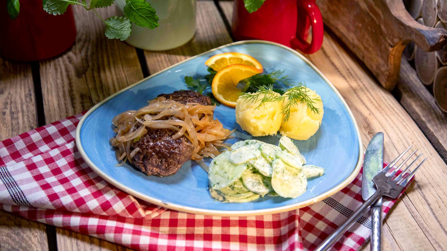 Daniem głównym jest kotlet z siekanego mięsa wołowego (choć w ludowej ojczyźnie bryzole robiono też z wieprzowiny), podany w towarzystwie smażonej cebuli, ziemniaczanego purée oraz klasycznej mizerii.