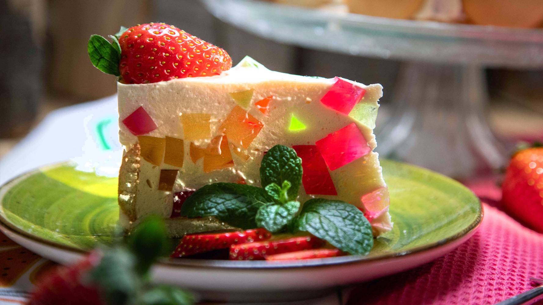 Deser jest smaczny i kolorowy. Sprawdź jak przyrządzić ciasto śmietanowe na zimno, naszpikowane galaretkami o różnych smakach a ozdobione świeżymi truskawkami.