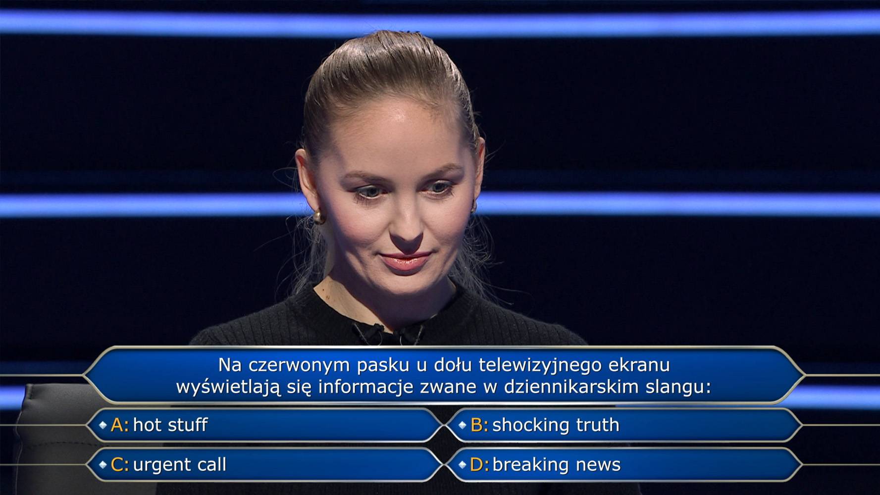 Następnie naprzeciw Huberta Urbańskiego zasiadła Katarzyna Czernecka, która pracuje jako psycholog w przedszkolu. Podczas pytania za 50 tysięcy złotych wykorzystała dwa koła ratunkowe - telefon do przyjaciela i pytanie do prowadzącego. Obie podpowiedzi okazały się niewystarczające, ale mimo to postanowiła zaryzykować. Odpowiedź okazała się nieprawidłowa i wyszła ze studia z czekiem na gwarantowaną kwotę 2 tysięcy złotych.