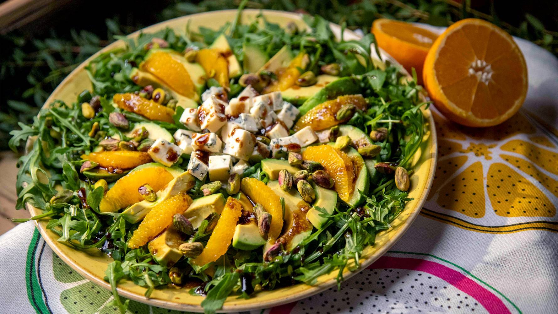 Awokado z pomarańczą na rukoli